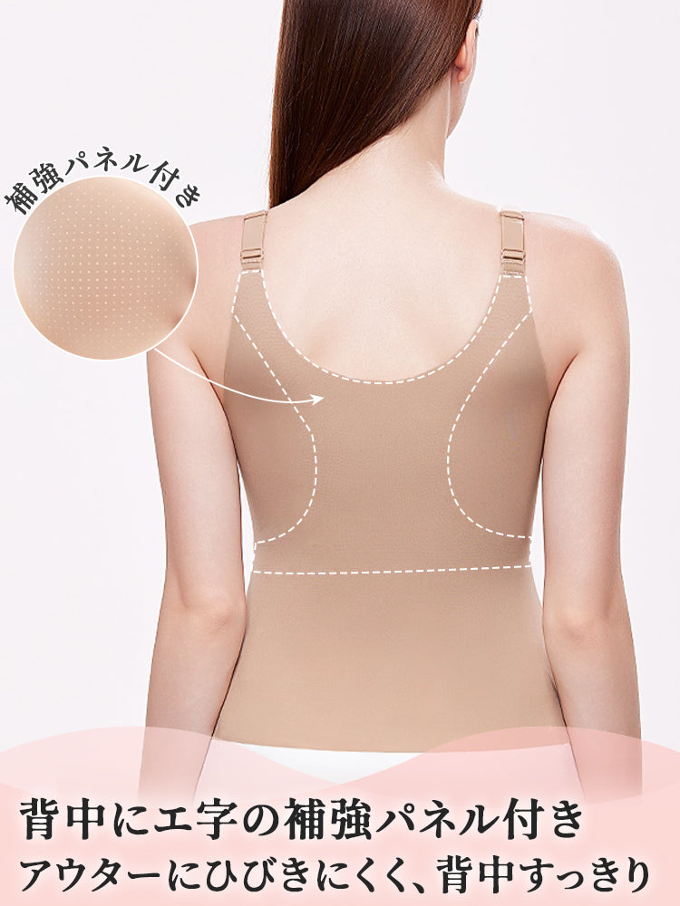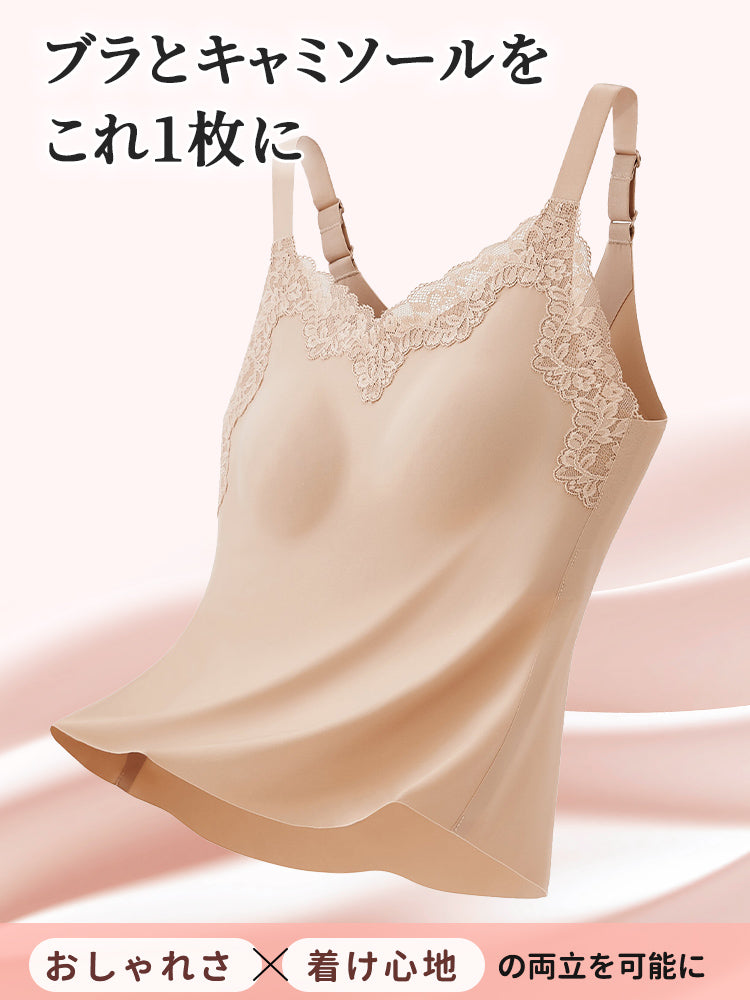 | こんな方におススメ | ・デザイン性のあるインナーが好きな方 ・従来のワイヤーブラの締め付け感や圧迫感が苦手な方 ・胸の安定感を求める方 ・ブラとキャミソールを別々に着るのではなく、一枚で済ませたい方 ・ブラなしでも快適に過ごしたい方へ |
