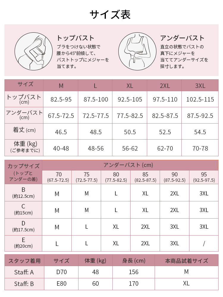 ・市販ブラがきつめの方は、普段より1サイズ上をおすすめします。
