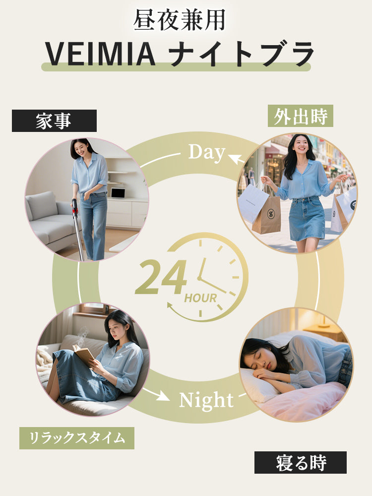 | 商品詳細 | VEIMIA ナイトブラ ~1日中使える: 「外出時」も「おうち」でも快適!育乳ナイトブラ: 着心地とホールド力を両立し、長時間のバストケアをサポート~抗菌ラテックスカップ: 抗菌・防ダニ仕様の固定カップで、洗濯機OK&いつでも清潔! |