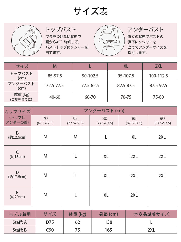 ・市販ブラがきつめの方は、普段より1サイズ上をおすすめします。