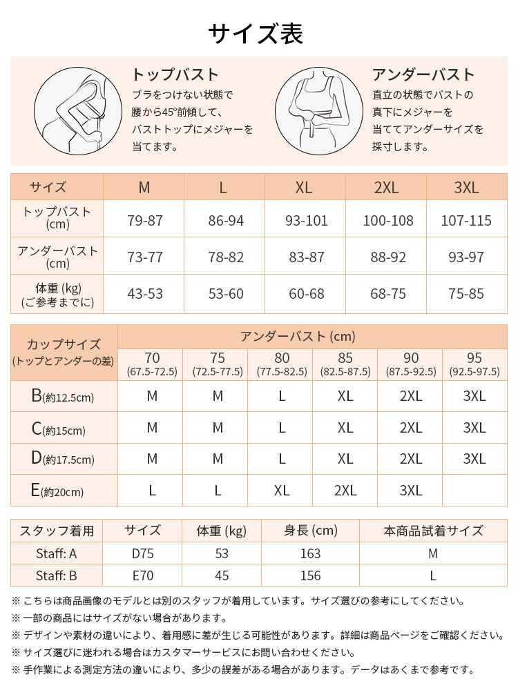 ・市販ブラがきつめの方は、普段より1サイズ上をおすすめします。