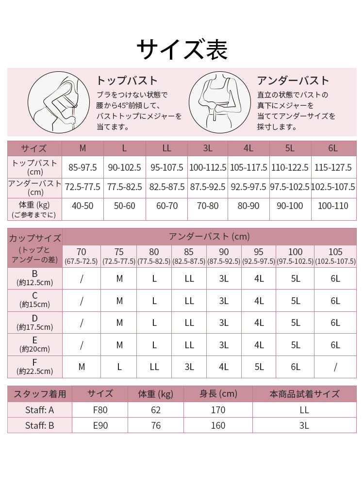 ・市販ブラがきつめの方は、普段より1サイズ上をおすすめします。