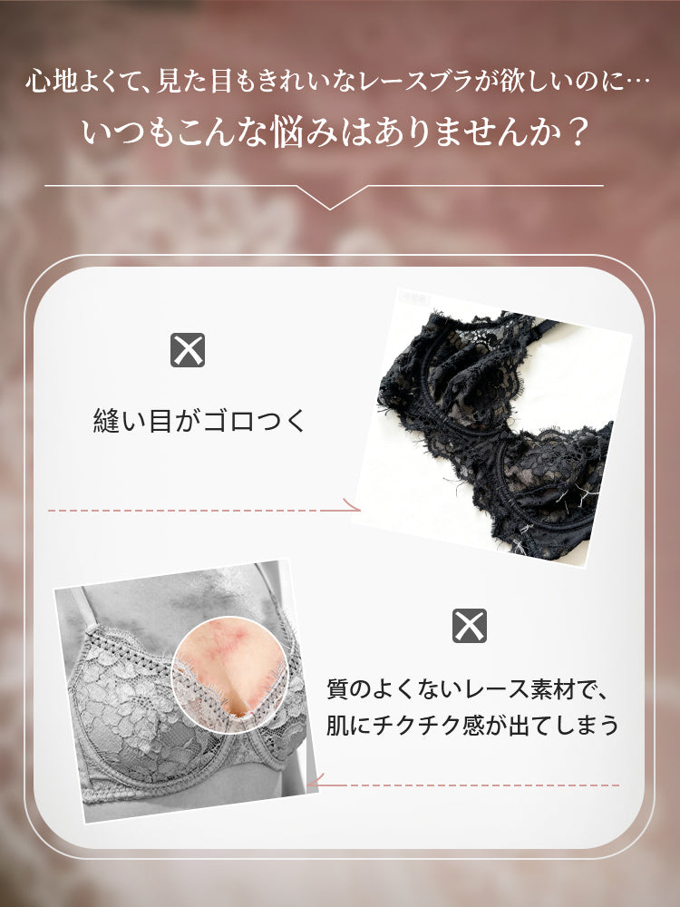 | こんな方におススメ | ・薄手トップスでもひびきにくいレースブラを探している方 ・バストを自然に寄せて、すっきり見せたい方 ・大きめバストを視覚的にコンパクトに見せたい方 ・通気性と快適さを重視する方 ・上品なフラワーレースデザインが好きな方 |