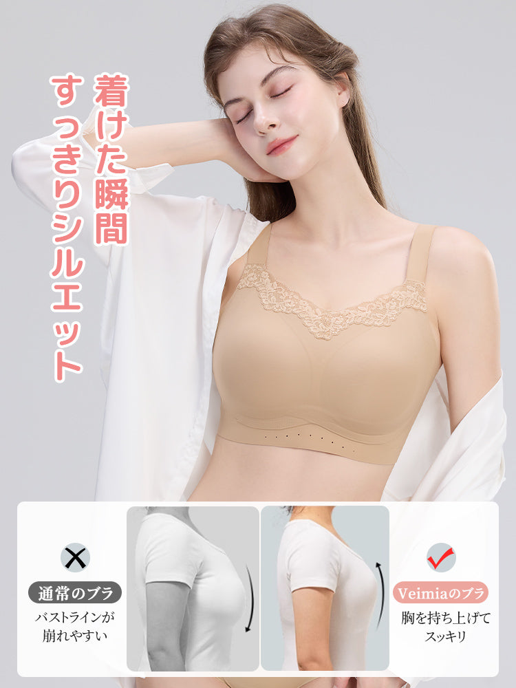 | 商品詳細 | VEIMIA 胸を小さく見せるブラ~しっかり包み込むフルカップ設計でバスト全体を安定して支え、自然にボリュームダウンした印象へ導きます。ノンワイヤー仕様とシームレス仕上げにより、まるで着けていないかのような快適さを実現し、日常から長時間着用までストレスフリーな小さく見せるブラです。 |