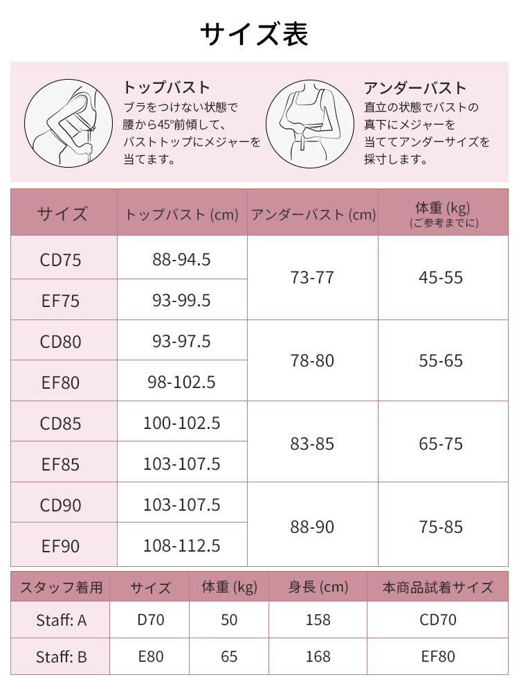 ・市販ブラがきつめの方は、普段より1サイズ上をおすすめします。