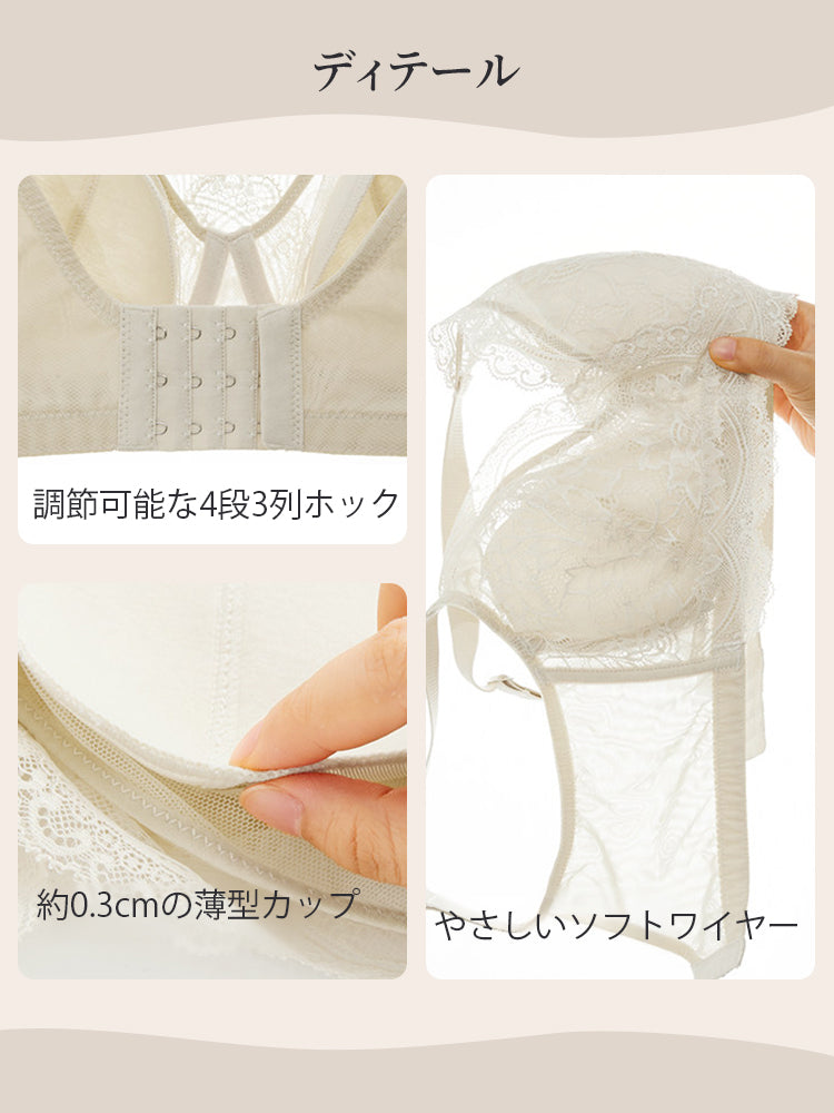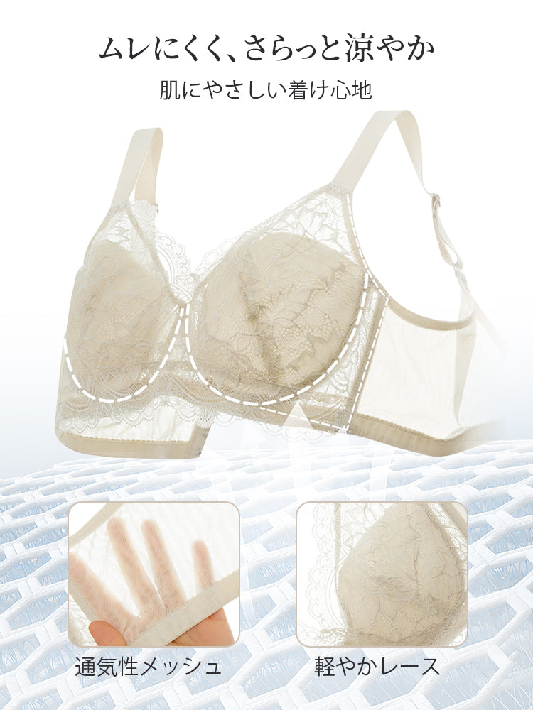 | こんな方におススメ | ・バストの下垂や広がりが気になり、補正ブラですっきり整えたい方 ・締め付け感の少ない補正ブラを探している方 ・レースデザインでも日常使いしやすい補正ブラを求める方 ・年齢によるバストラインの変化が気になり始めた方 |