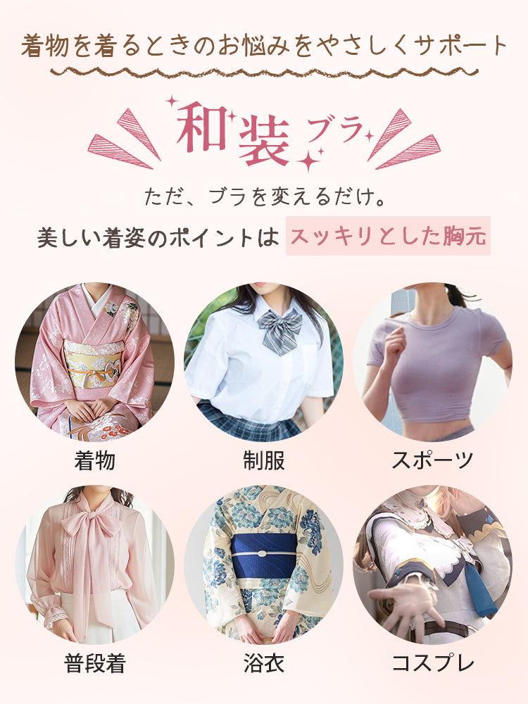 | こんな方におススメ | ・和装のときに、胸元をすっきり自然に整えたい方 ・締め付け感が苦手で、軽やかな着け心地を重視する方 ・ムレにくく、長時間でも快適に使える和装ブラを探している方 |