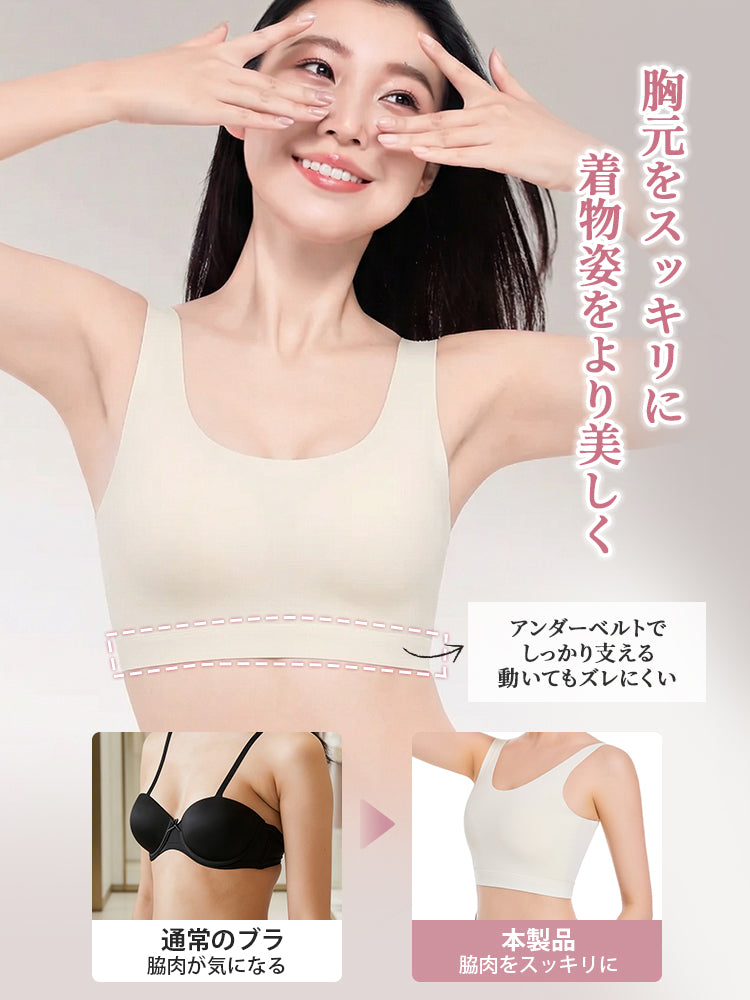 | 商品詳細 | VEIMIA 和装ブラ~胸元をすっきり整え、美しい着姿を引き立てるために設計されたブラ。バストのボリュームをやさしく抑え、脇へ流れにくい構造で、着物や浴衣でも胸元がもたつかず上品な印象に仕上がります。薄手の服や白いシャツにもひびきにくく、和装から普段着まで快適に着用できる。 |