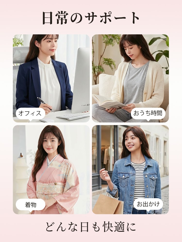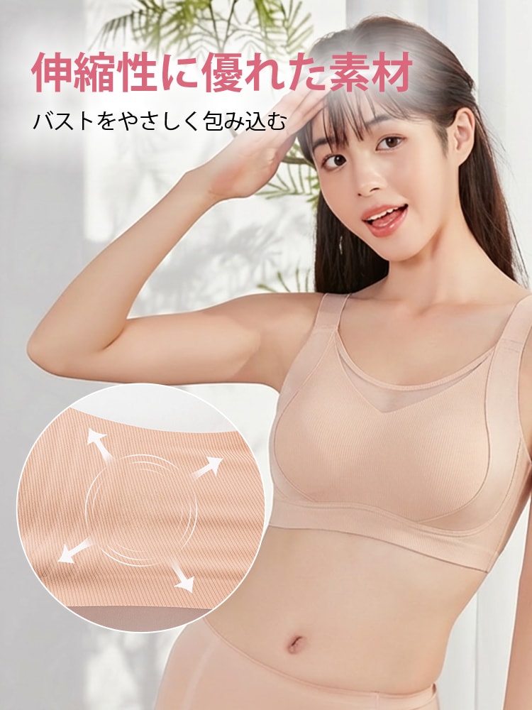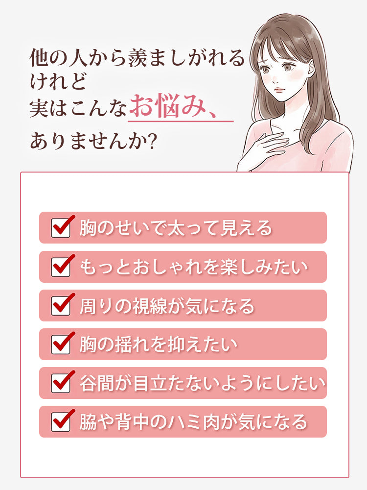 | こんな方におススメ | ・バストのボリュームを自然に抑え、小さく見せたい方 ・すっきりしたシルエットで洋服をきれいに着こなしたい方 ・ノンワイヤーでやさしい着け心地を求める方 ・長時間着用しても快適な日常使いブラを探している方 |