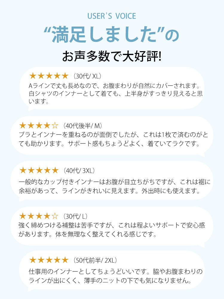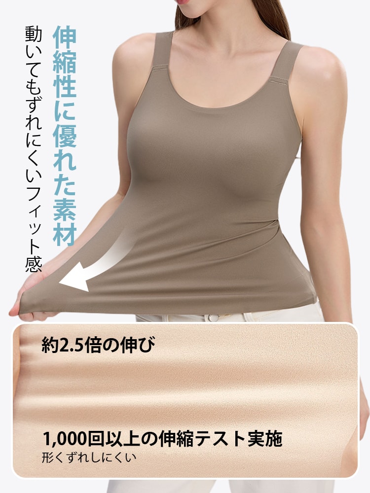 | こんな方におススメ | ・脇や体のラインをすっきり見せたい方 ・ブラとインナーの重ね着を減らしたい方 ・大きなバストでも安定感のあるインナーを探している方 ・白シャツや薄手トップスでもひびきにくいインナーを求める方 |