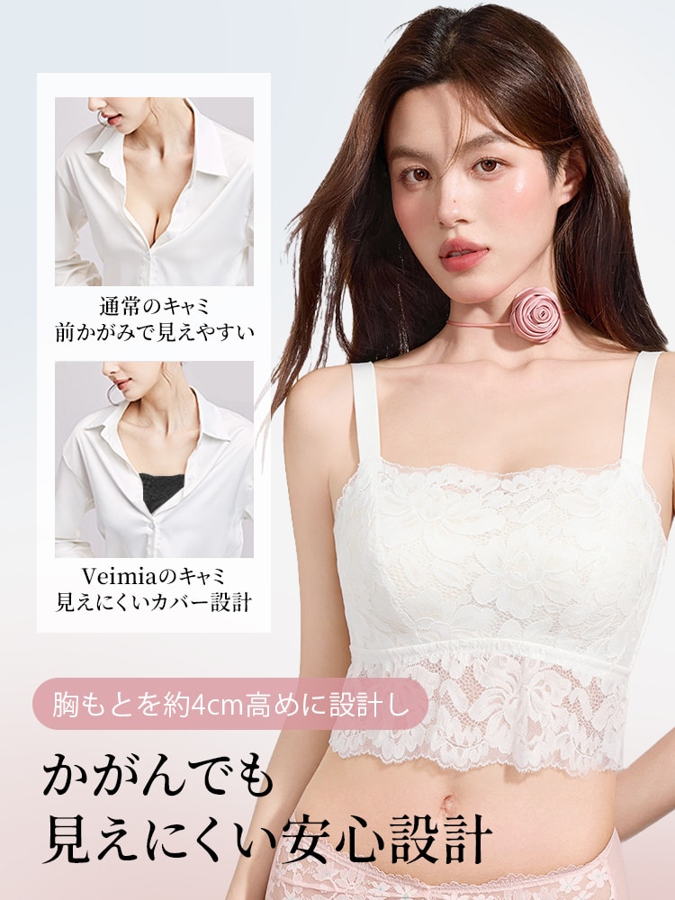 | 商品詳細 | VEIMIA キャミソール ~ レースが映えるきれいな背中を演出し、さらっと快適な着心地を叶えるカップ付きキャミソールです。胸もとを高めに設計し、見えにくく安心感があり、見せる着こなしにも自然に馴染みます。ノンワイヤーながら安定感があり、すっきりと美しいシルエットをキープします。 |