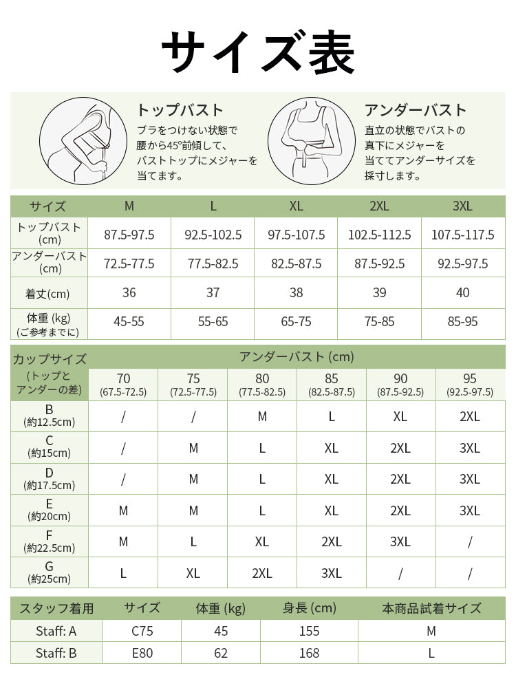 ・市販ブラがきつめの方は、普段より1サイズ上をおすすめします。