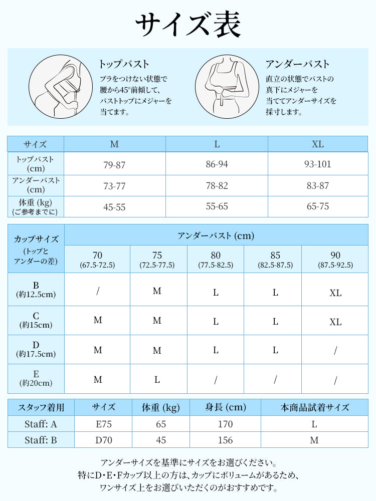・市販ブラがきつめの方は、普段より1サイズ上をおすすめします。