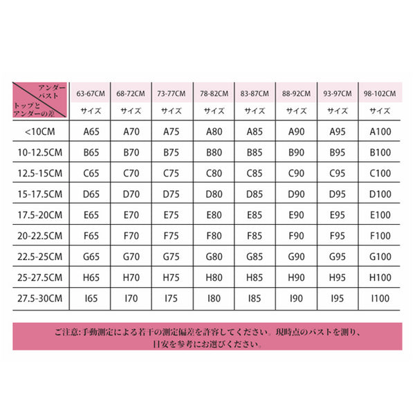 | サイズ | B75 B80 B85 B90 B95 C75 C80 C85 C90 C95 D75 D80 D85 D90 D95 E75 E80 E85 E90 E95 F75 G75 F80 G80 F85 G85 F90 G90 F95 G95 |