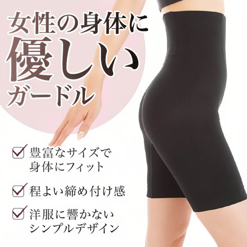 | こんな方におススメ | ・産後の体型をキリっと整えて見せたい! ・子供を産んでから腰回りが不安… ・ハードなガードルは苦しくて苦手な方。 ・気軽にはけるやわらかなタイプのガードルを試したい方。 ・お尻を丸くきれいに見せたい! |