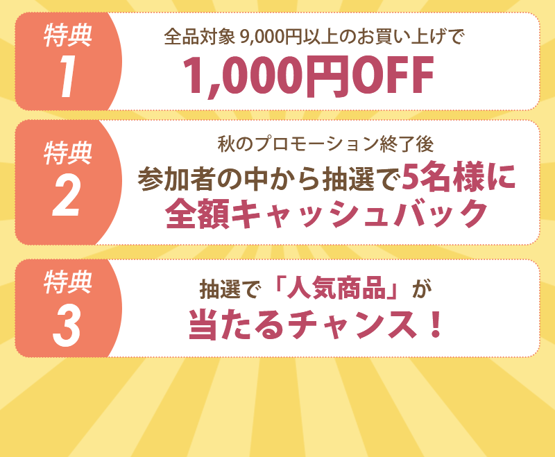 キャンペーン期間中に秋のセール商品を購入された方は、免除抽選にご参加いただけます。キャンペーン終了後、5名様を抽選で選び、全額免除の特典をプレゼントします!