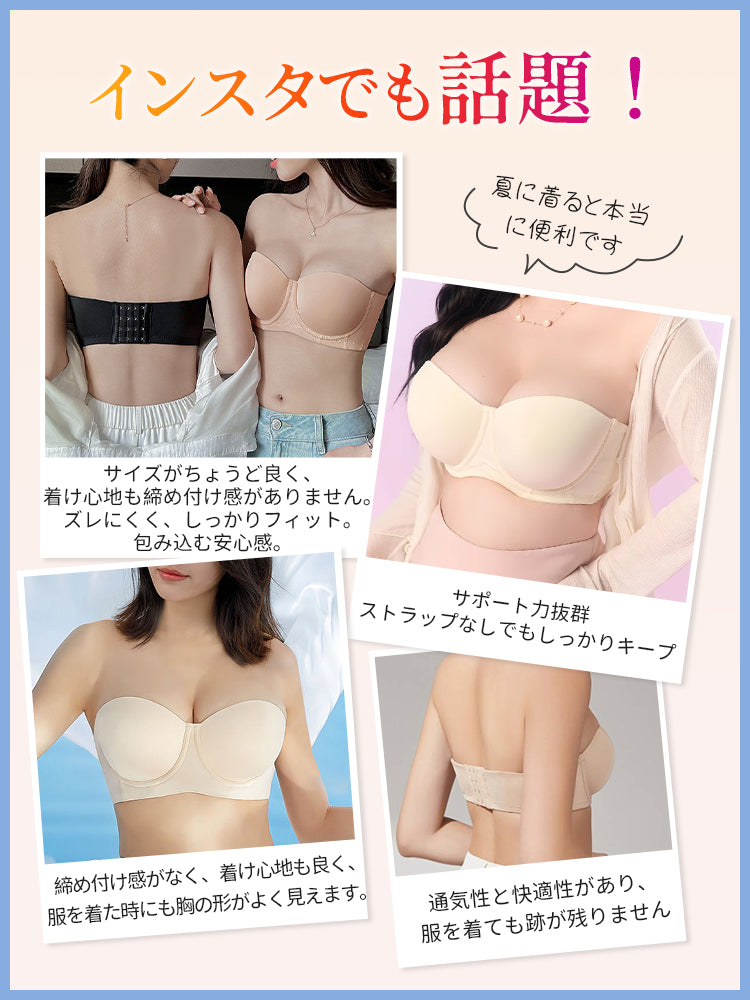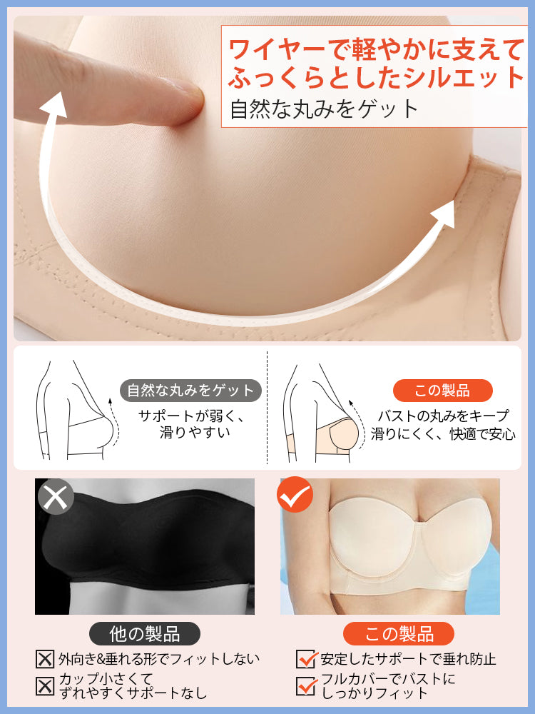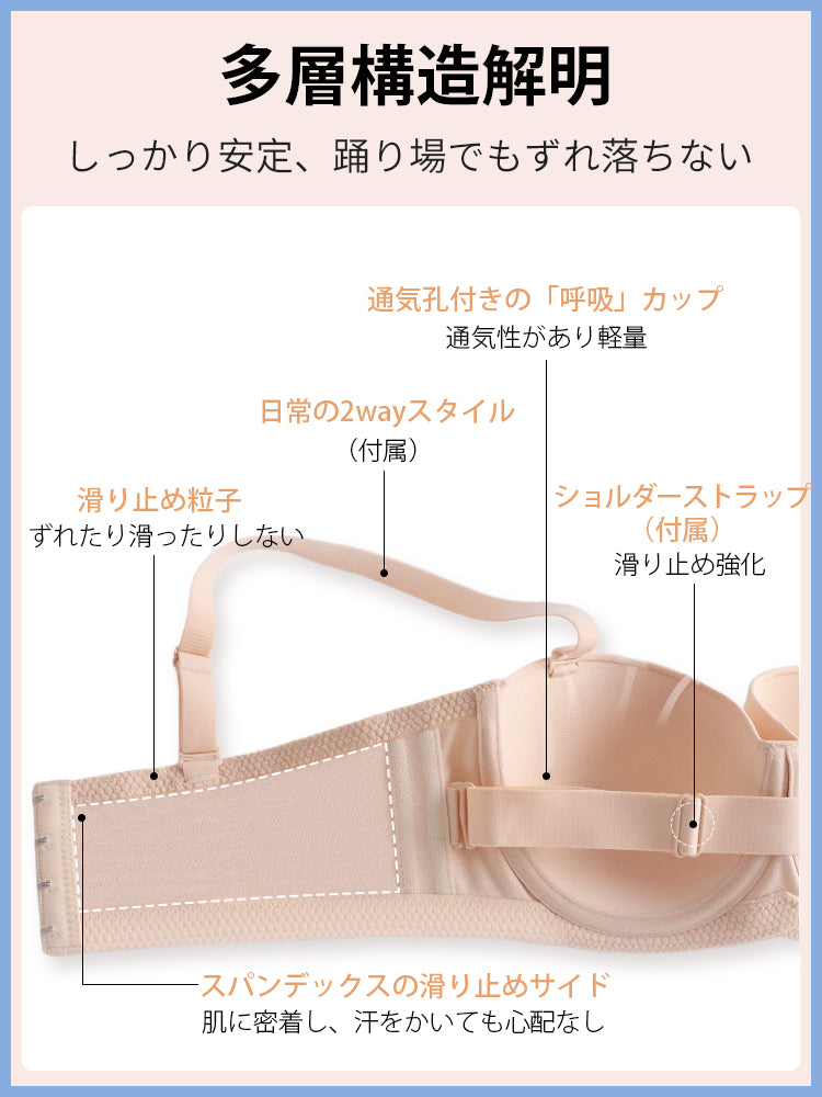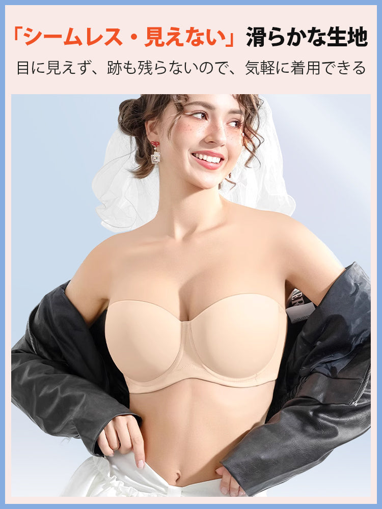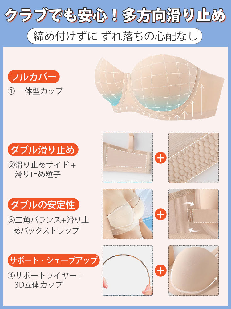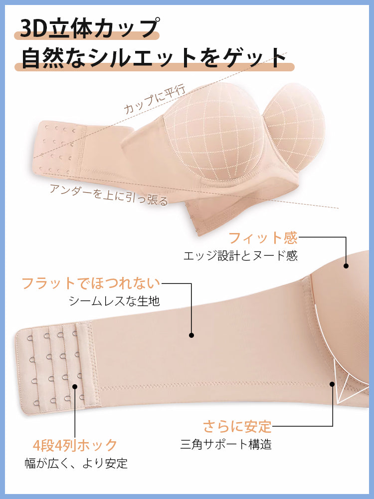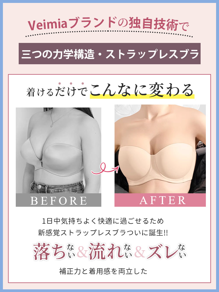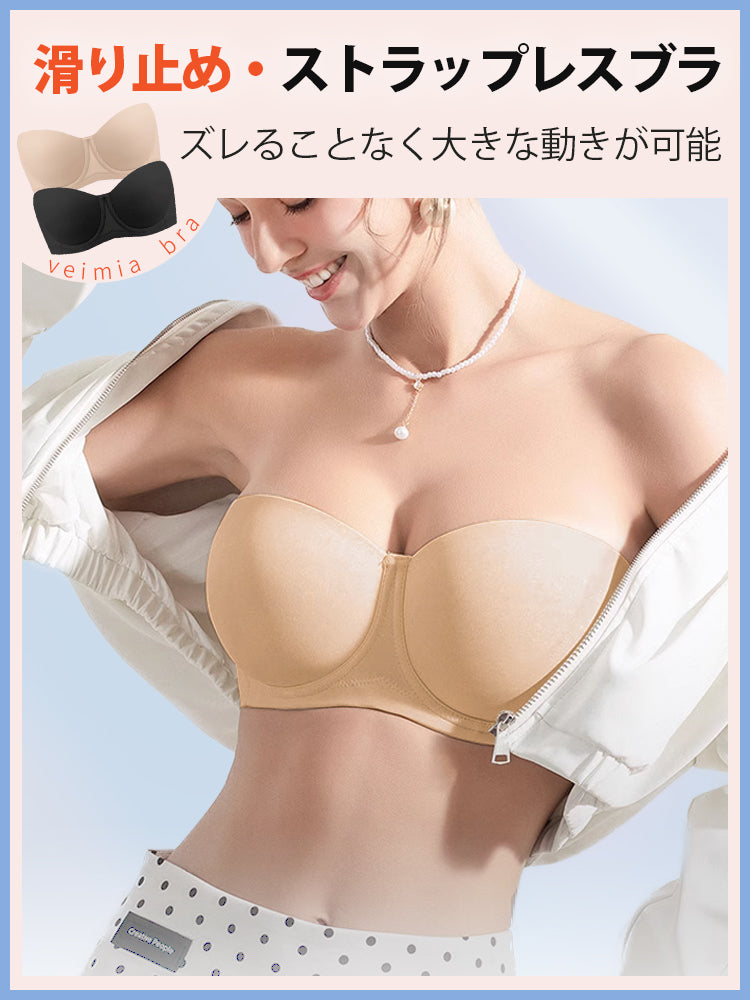 | 商品詳細 | VEIMIA ストラップレスブラ ズレ防止ぴったりフィット!三重構造で走ってもズレない安定感が魅力♪3D立体カップが自然な丸みとすっきりラインを演出~ハニカム構造の通気カップで夏でもムレにくく快適、長時間の着用もストレスフリー!肩紐なしで美しいデコルテを引き立て、どんなファッションにもマッチ。イベントや日常使いに理想的なブラ! |