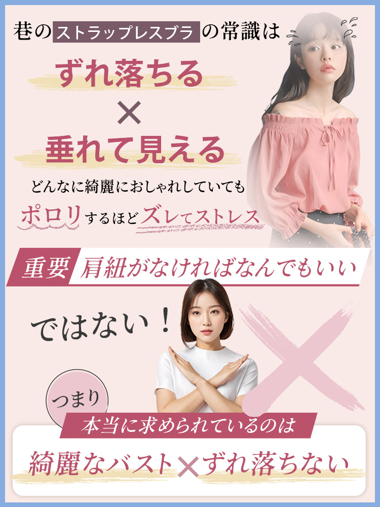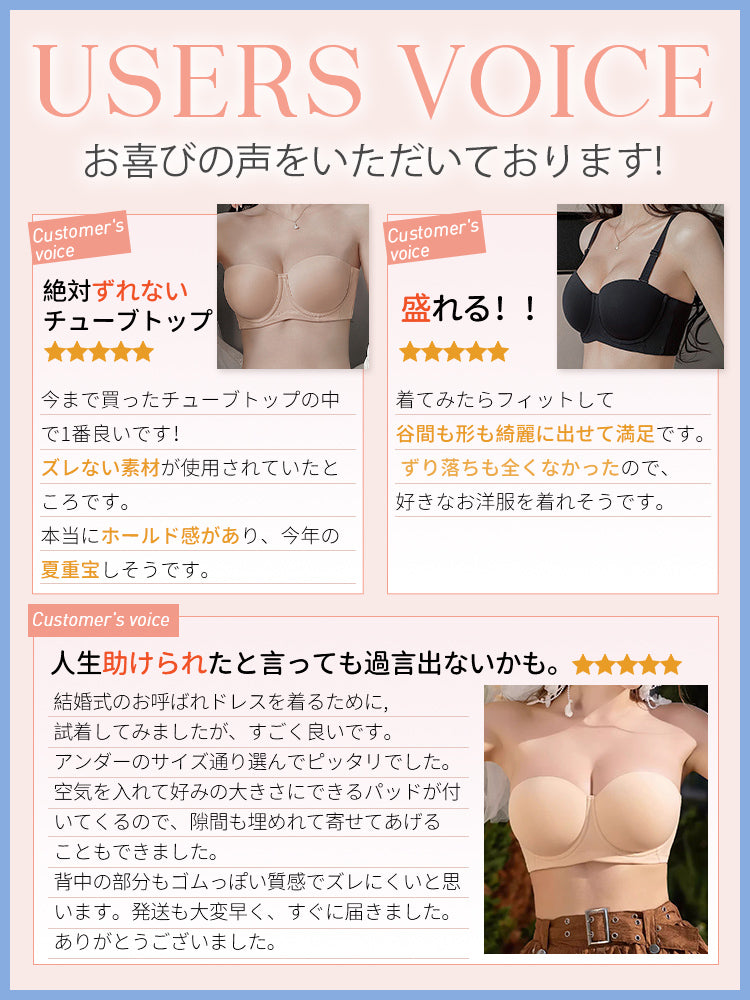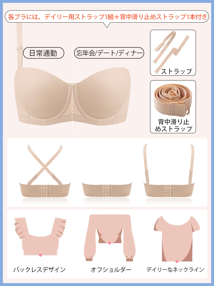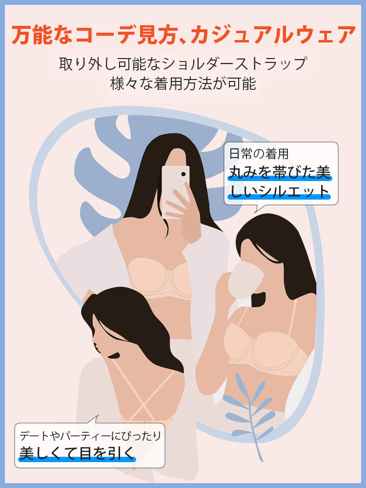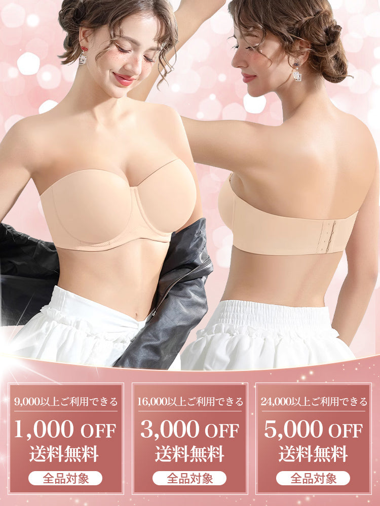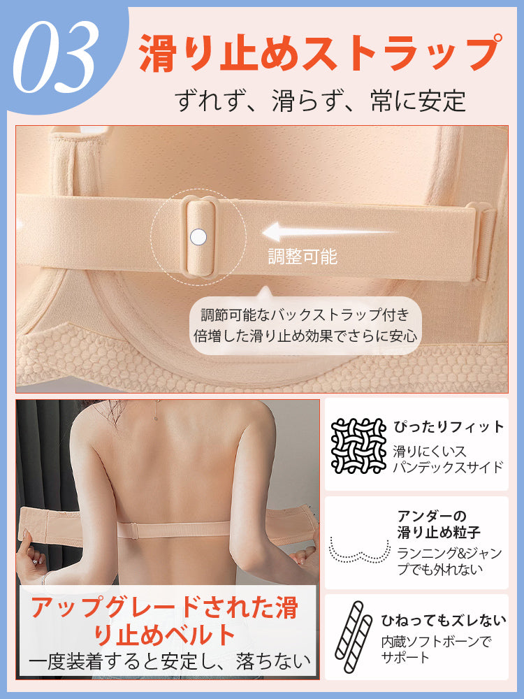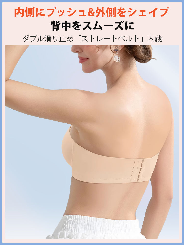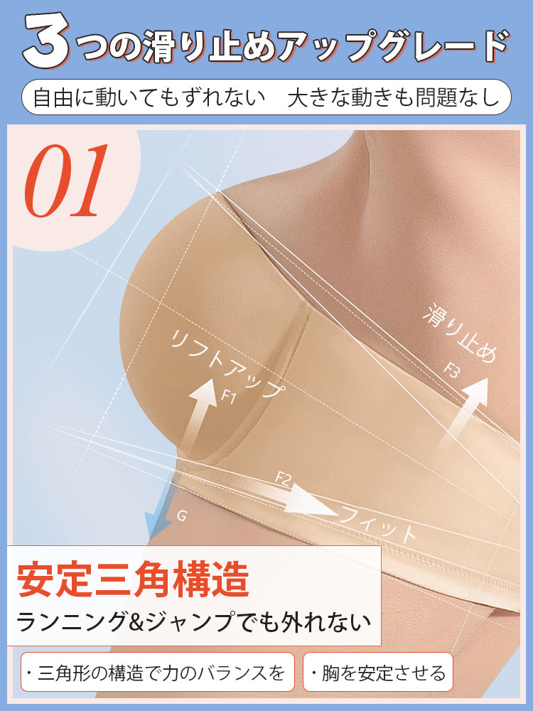 | 商品詳細 | VEIMIA ストラップレスブラ ズレ防止ぴったりフィット!三重構造で走ってもズレない安定感が魅力♪3D立体カップが自然な丸みとすっきりラインを演出~ハニカム構造の通気カップで夏でもムレにくく快適、長時間の着用もストレスフリー!肩紐なしで美しいデコルテを引き立て、どんなファッションにもマッチ。イベントや日常使いに理想的なブラ! |