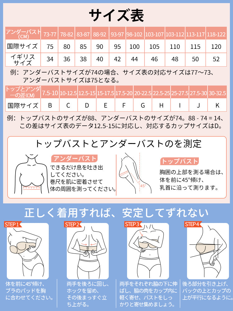 ・市販ブラがきつめの方は、普段より1サイズ上をおすすめします。